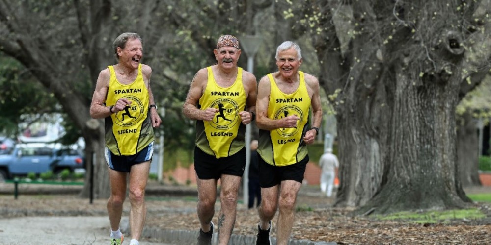 Pictured above from left: Wayne Thompson, John Dobson (bandanna) and David Foskey (white hair) are training to run their 47th Melbourne Marathon. They are the only three people who have run every Melbourne Marathon since the event started in 1978. Picture by JOE ARMAO. Photo and details by kind permission of The Age newspaper, 23rd September 2025.
