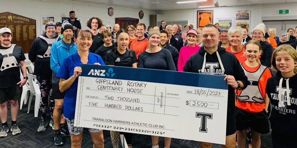 Above: Harriers President Phil Mayor Presents a cheque to Tanya Whitehead from Gippsland Rotary Centenary House.
